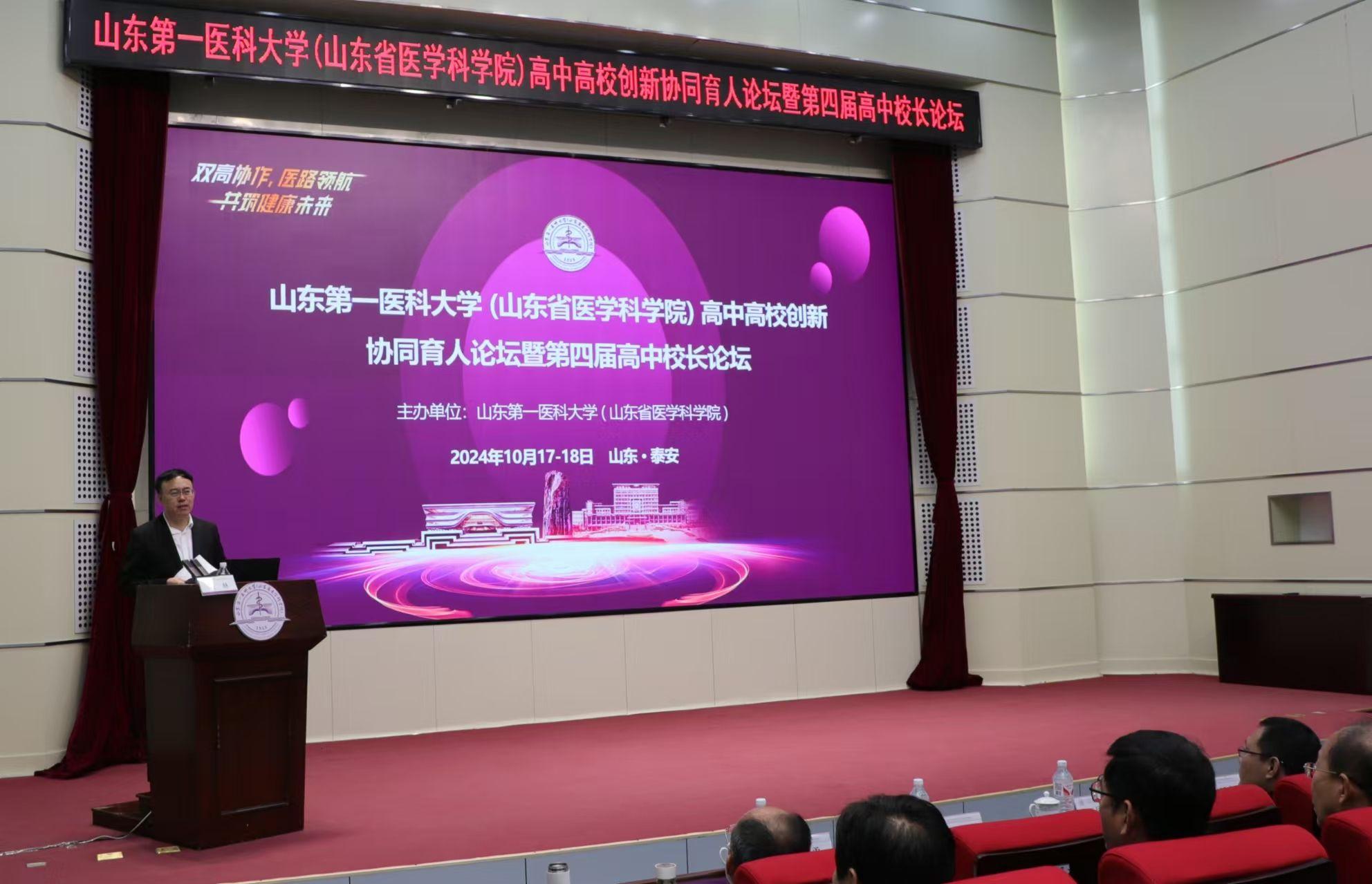10月18日,山东第一医科大学(山东省医学科学院)高中高校创新协同育人论坛暨第四届高中校长论坛在泰安校区举办。来自省内外35所高中、16所高校的近百位代表参加会议。中国科学院院士、校(院)长陆林出席论坛并致辞,省教育厅、泰安市教育局有关领导参加会议,副校(院)长刘传勇主持。
